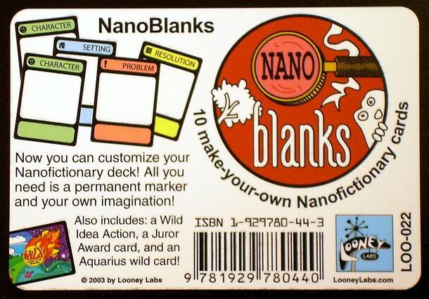 From the official product page on the Looney Labs website; NanoBlanks are packets of do-it-yourself expansion cards for Nanofictionary (much like Fluxx Blanxx are for Fluxx). Each pack contains 10 semi-blank cards for you to be creative with: 4 Characters, 2 Settings, 2 Problems, and 2 Resolutions. Buy NanoBlanks! Each packet of NanoBlanks also includes:...