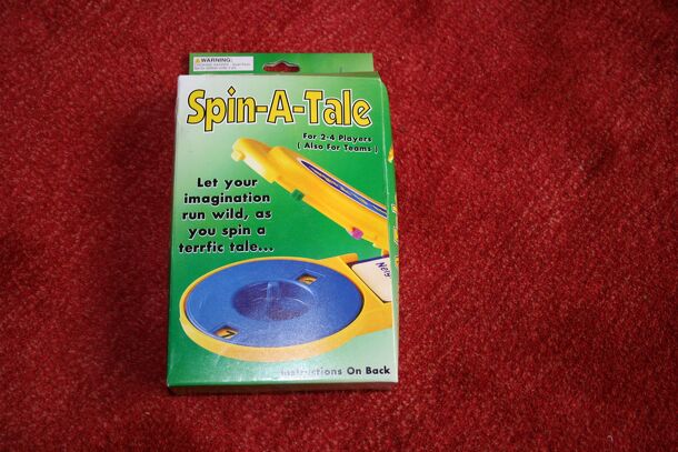 "Let your imagination run wild, as you spin a terrific tale..." This game comes in a yellow plastic case, which holds the spinner and cards, and has clips built into the side for score-keeping. Players take turns spinning the spinner, which will display a number (4,5,6, or 7) and a happy or sad face. That player must then take that number of cards (which...