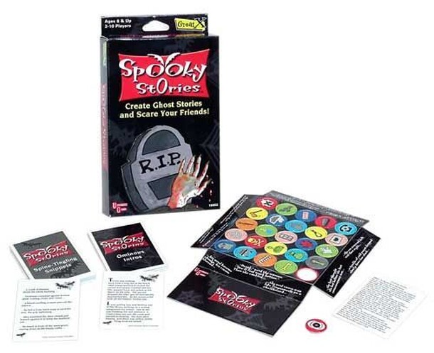 The box contains two different decks of cards for two different games. They have the potential to be scary, but are for ages 8 and up. One is a 76 card storytelling game, which includes text cards for beginnings, segues and endings. Black and white line drawings depict characters, settings, things, actions and embellishments. A storyteller uses up their...