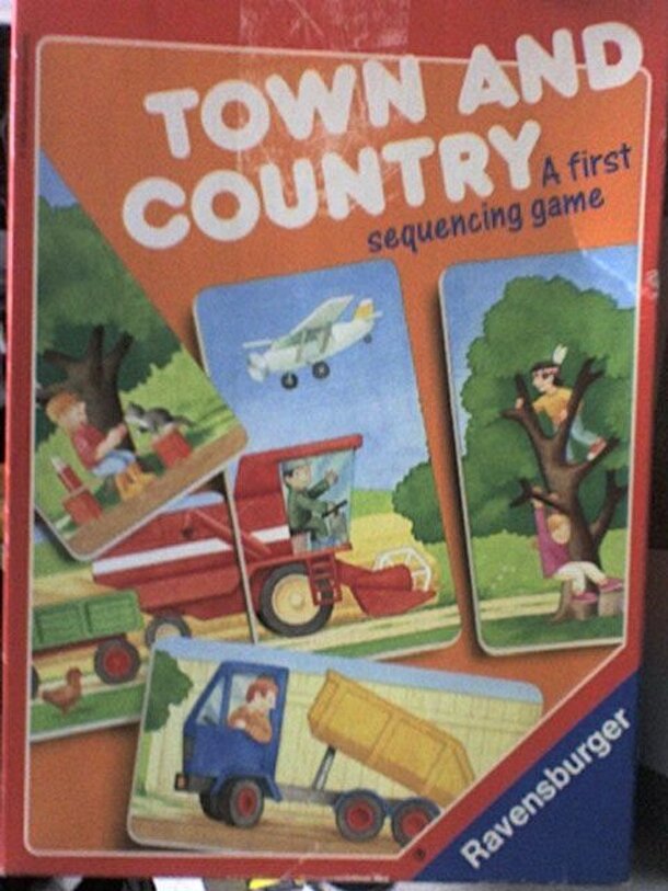 Many stories can be told and many adventures await in this clever sequencing game for young children. As card after card is placed in a row, story pictures are created to talk about and share. Players complete country or town scenes by matching the pictures, one after the other. "Here's a farm with lots of animals! There's a truck carrying a big load"....