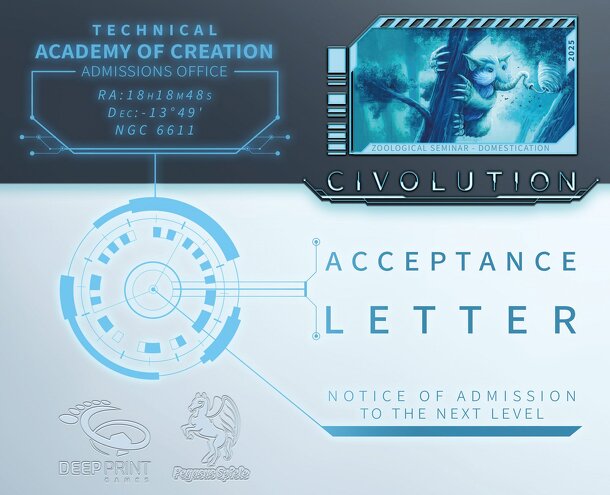 After the final exam, you will receive the admission notice Hello students! After you have completed your final exam, your “Civolution” at the Technical Creation Academy, it is now time for your acceptance letter! The Civolution expansion “Acceptance Letter” includes 3 mini-expansions that can be added individually or all together. Six additional starting...