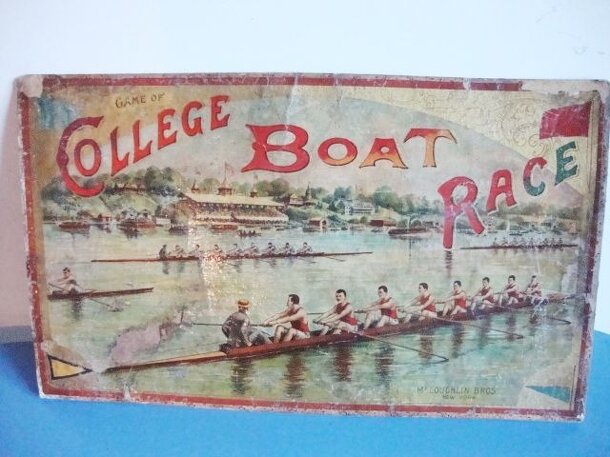"College Boat Race" shows the sport of rowing. The actual board is fixed to the inside box bottom. The walls of the box bottom are made of wood, covered with decorative paper. Components: four wooden "men" playing pieces and a cardboard spinner with a metal arrow. Game board shows a u-shaped track around an island with a boat house at the shore and a house...
