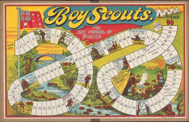 Boy Scouts is an Australian patriotic game first registered in 1911 by the National Game Company. Subsequent later versions appeared until around the 1930s. The game is a simple roll and move mechnism along a path starting at the Australian red ensign flag and progressing to a final camp destination 90 moves away. The later version has the flag at the end....