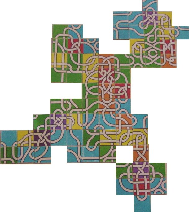A tile based game of building and scoring closed loops for 2 or more players CONTENTS: The game consists of 144 square, double sided tiles, each containing an image of a unique arrangement of one to four white strands. Each strand connects any two of eight positions spaced equally around the perimeter of the square, with no two strands sharing edge...