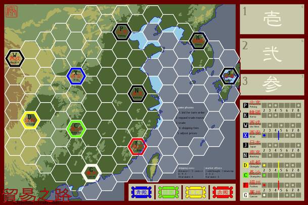 貿易之路 (Màoyìzhīlù - trade roads) is an economic game set in Silk road era China. It is more a game about economics and game theory than about China and its neighbors, however. Routes in 貿易之路 (Màoyìzhīlù - trade roads), the 'trade roads' of the title are chains of trading posts / inns etc. that you as a merchant can choose to use. All trade roads can be used...