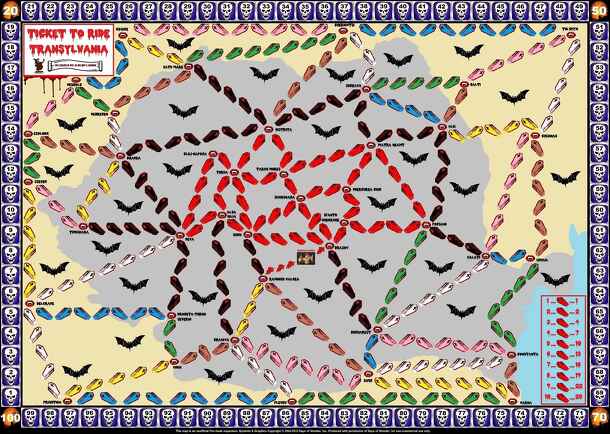 This map is an unofficial Fan made expansion. Symbols & Graphics Copyright © 2004-2015 Days of Wonder, Inc. Produced with permission of Days of Wonder, for non-commercial use only. This follows the principles of the basic Ticket to Ride game with a vampire theme and the option to visit Dracula's castle. The object of the game is to gain the most points by...