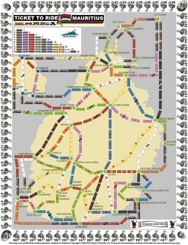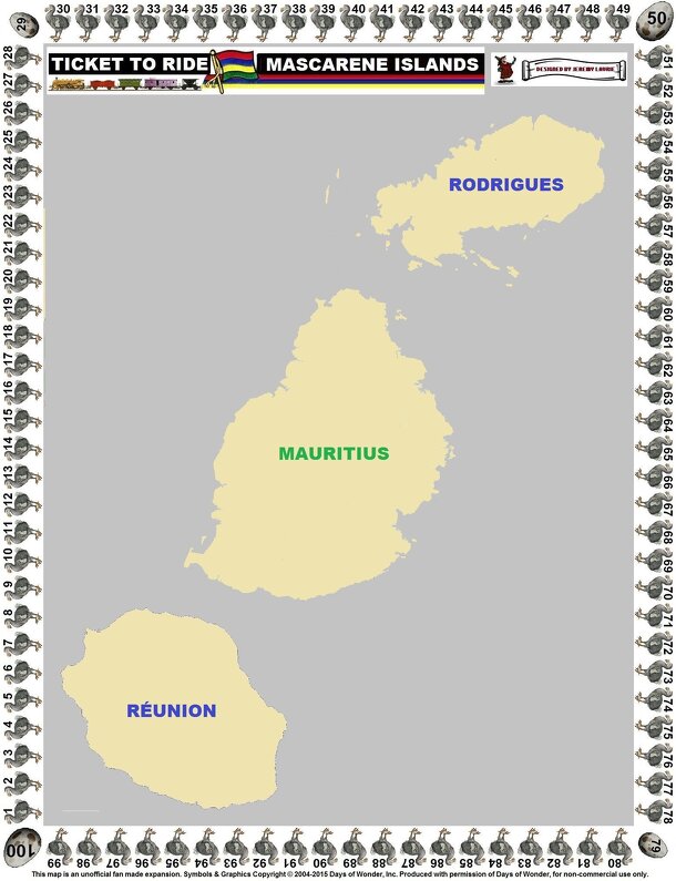 This game is a combination of the three games: Réunion & Mauritius, Mauritius & Réunion and Rodrigues & Mauritius. The rules for each game are consistent and apply to this game also. You will need all three boards (side by side in that order) and tickets plus each player will need three sets of wagons (one for each board). You will start with your markers...