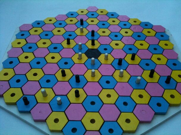 Trig is the root form of a suite of three games collectively entitled The Summer-House Floor. It's a centrifugal connection game played on the Colour A and Colour B pathways of a regular, 127-cell hex-hex board coloured non-contiguously in Colour A, Colour B and Colour C (Colour C at the corners), with a single black cell - known as the Pillar - at its...