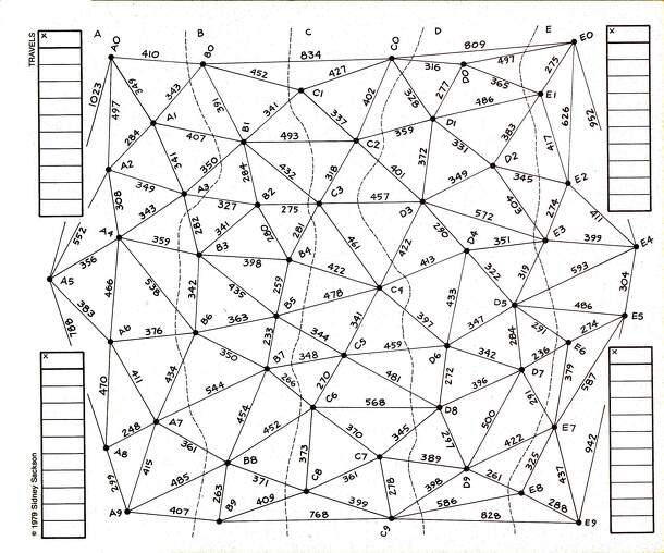 Travels is one of six pencil and paper games described in the Sid Sackson book, Calculate! . The playing sheet is similar to the “distances between major cities” schematic diagram found in a road atlas. It shows roadway segments and mileage connecting 50 cities. A mathematical operation is performed on the calculator to randomly select 10 of the cities....