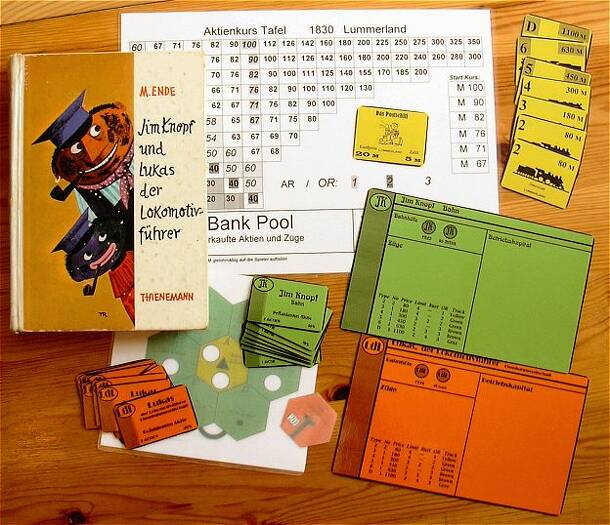 Lummerland is an island from the novel for children 'Jim Button and Luke the Engine Driver (Jim Knopf und Lukas der Lokomotivführer)' by Michael Ende. In the original map the hexes are named after the figures in the novel C4 = Jim Knopf (came to the island by post), C8 = Lukas, the engine driver, C6 = Alfons, quarter to twelfth (the king), D7 = Mr. Sleeve...