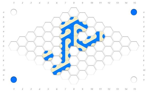 A connection game played on a triangular board made up of hexagonal cells. The object is connect the three sides of the board by a continuous path. Pieces are hexagonal tiles that contain both players' colors. Players alternate turns, placing a tile in one of three possible orientations on a board hexagon. The game now comes in several different rule-set...