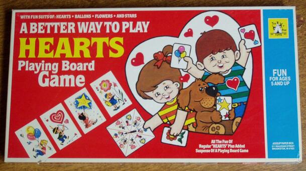 The version has two different games. The first game involves players moving playing pieces from start to finish. Players attempt to take tricks of balloons, stars, and flowers while avoiding the hearts. The player taking the highest numbered card in the leading suit takes the trick. After all cards are played, players move their markers ahead 1 space for...