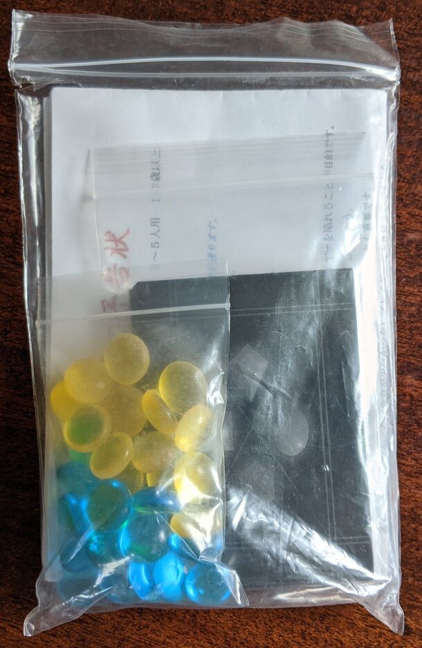 宝石泥棒の予告状 (Houseki Dorobou no Yokokujou) is a game from Japan, meaning something like 'The Jewel Thief's Letter of Warning'. Originally produced in 2007, it was re-issued at the Tokyo Game Market in 2015. This a trick-taking game but players don't have to -and may not want to- follow the colour (suit) lead. The cards show one, two or three colours each, and...
