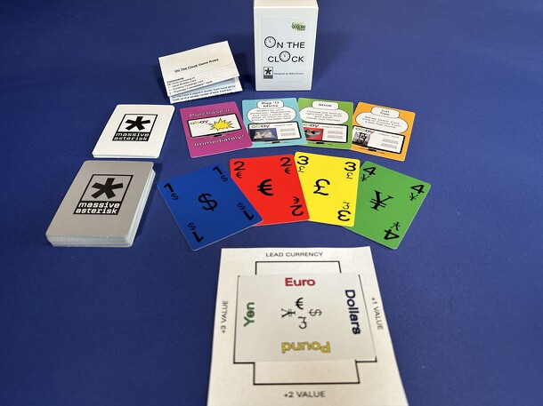 On The Clock is a trick-taking game where players are bidding on items from the "oBoy" online auction site. Once an item is up for auction, players will engage in a "must follow" trick-taking mini game to determine who will be "On The Clock". The "On The Clock" player will be the one who played the highest value of the Lead Currency. Every other player...