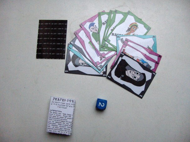 PEAS is a two-player "trick lane" game in which each trick is assigned a number of points (roughly -2 to +3). On your turn, you can play to any of the tricks; if you are the second to play to a specific trick, you must follow the suit of the first card played there, if possible. The first person to play to the first trick will lead in the first trick;...