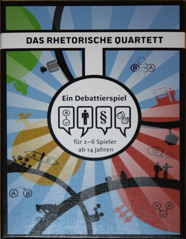 Das Rethorische Quartett is a trick taking and communication game. First, player agree on a topic and on opineons every player represents. Each player has cards in his hand showing a kind of argumentations (not an argument, but something lika "non-representative statistic" or "personal attack" or "interpretational sovereignty". By turns players play cards...