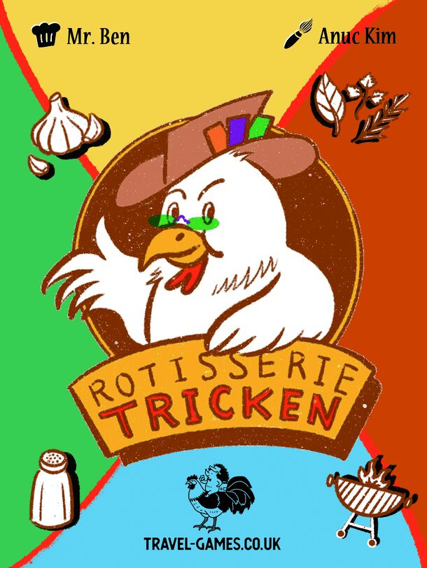 Rotisserie Tricken is a quick and tasty 18-card trick-taking game for 3 players, where your bidding skills will earn you the juiciest points! Each round, players aim to take tricks and hit their bid, with the lowest scorer picking the flavour of the next round (herb, garlic, barbecue, or "classic" chicken). This clever twist keeps everyone in the game...