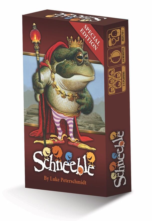 Schneeble is a light trick-taking game where the goal is to win a randomly generated (d6) number of tricks. As such, it's much more about HOW you play your cards than trick-taking games that follow a bidding process. Cards in Schneeble are suitless and run from 1-10 with the addition of a small number of "special effect" cards ("all players play their...