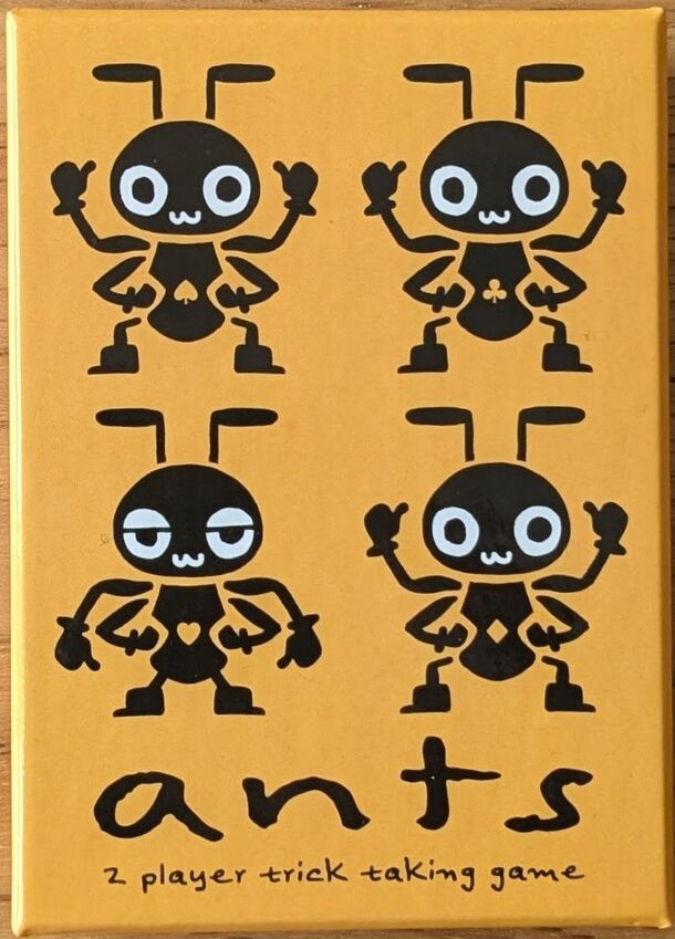 Ants is a trick-taking game for 2 players. Players rearrange the hand they are dealt into cards they will follow with and cards they will lead with. They demarcate this with a "Queen" card. The Queen card is the only card that could be used to lead or follow. The game lasts for a single hand, with the first player to win a trick that includes the Queen...