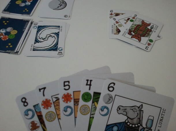 Snakebit is a trick-taking game that uses the Decktet deck. At the start of each hand, two cards are randomly drawn to determine the trump suit and the cursed suit, and players are trying to collect tricks without having to take any cards from the cursed suit. Of course, the dual suits of the cards may make this harder than it sounds! The game is somewhat...