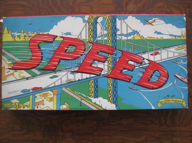 The object of Speed is for the player to move his/her ship, plane, car and train along the designated routes from start to finish. The first player completing the routes for all four vehicles wins. Two to four players may play. There are 16 player pieces. One each of ship, plane, car and train in four colors (red, green, black and blue) Movement is driven...