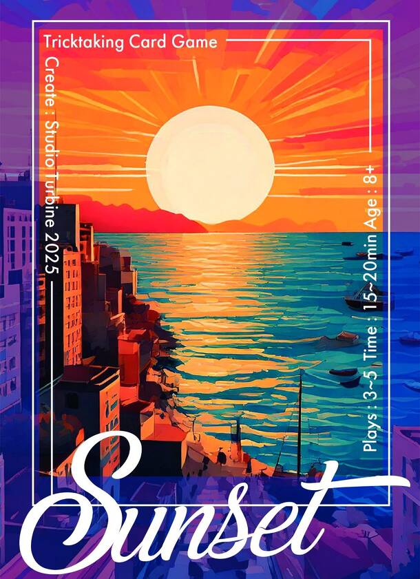 In the city, by the sea, across the desert—once again, the sun sets today. Before night falls, in this fleeting twilight, Shadows intertwine and then scatter. This is such a game. Even the cards you place may unexpectedly merge together... Sunset is a must-follow trick-taking game with five suits, each numbered 0 to 9 (10 cards per suit) where half of your...