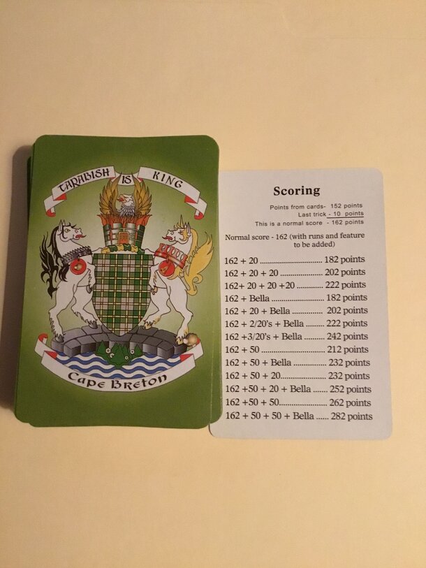 Tarabish, also known by its slang term Bish, is a trick-taking card game of complex rules derived from Belote, a game of the Jass family. The actual pronunciation of the name is "tar-bish", even though it can be spelled "tarabish". It is played primarily by the people of Cape Breton, Nova Scotia, in Canada, where it was brought in 1901 by a Lebanese...