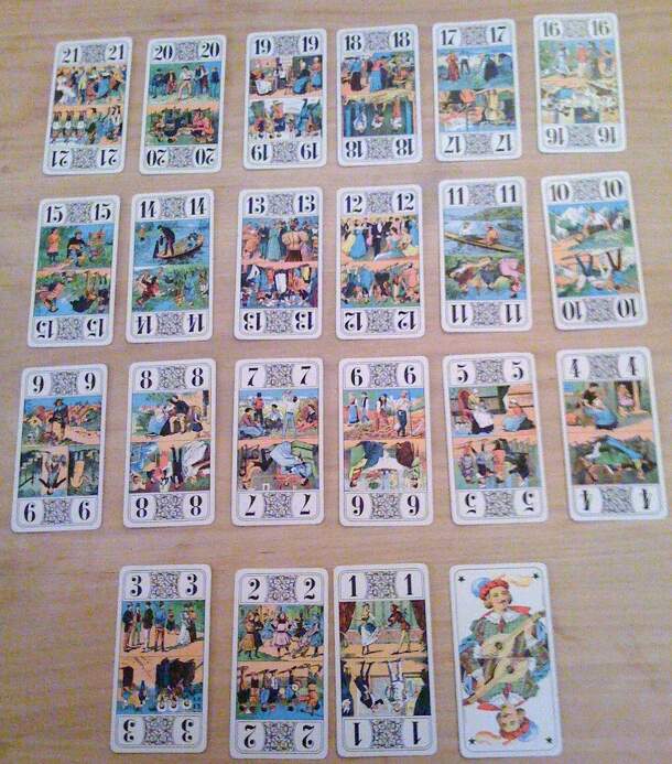 Not to be confused with divinatory tarot, the game of tarot probably comes from Italy. It is played with a 78-card deck that has 56 suited cards (similar to the 52-card Poker deck, with the addition of a Cavalier or Knight court card between the Jack and Queen in each suit), plus 21 suitless trump cards in ascending rank, and one "Fool", similar to the...