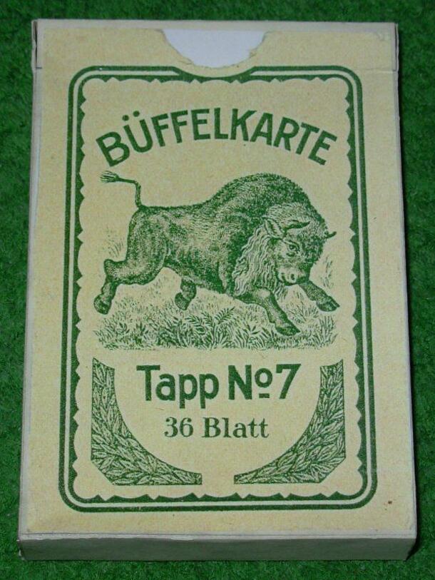 Tapp is a regional (Southwestern Germany / Wuerttemberg) traditional trick taking game with 36 Cards (4 suits, french cards from 6 up to Ace, worth 11 (ace), 10 (10), 4 (King), 3 (Queen), 2 (Jack) and zero (6,7,8,9)), with similarities to Skat, Binokel and Tarock. Each player gets eleven cards (3 player-game) three are laid aside as the "talon" or 8 cards...