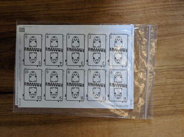 3番目に強いもぐら, roughly translated as Third Strongest Mole, is a 5-player only trick-taking game with one suit. The game consists of 37 cards, ranked 1 to 37, and 3 front and back rule cards, printed on 4 sheets of perforated business card stock. All but 2 cards are dealt to the players, and the remaining 2 cards are set aside face up, with one designated for...