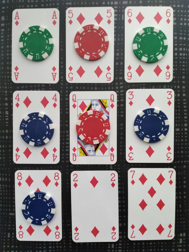 This game is played with parts of two standard deck of cards and 18 poker chips or other counters. One each of A, 2, 3, 4, 5, 6, 7, 8, and Queen from one of the deck is arranged in a 3x3 grid with the Queen in the middle but otherwise randomly. These "scorecards" form the board. The cards A-K-Q-J-10-9-8-7-6 from the other deck are shuffled and each player...