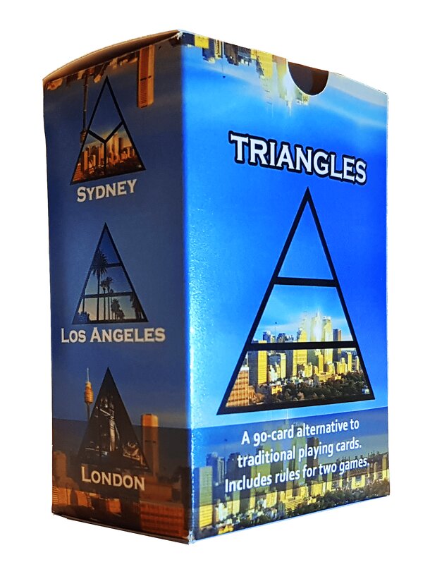 Description from the publisher: Triangles is a series of 90-card decks of playing cards. Each card represents a piece of a triangle, numbered 1-3. The triangles are "cut" in one of three ways (horizontal, vertical and centered cut) which works as suits, and the numbers 1, 2 and 3 of the same cut make a complete triangle. There are 81 triangle pieces and 9...