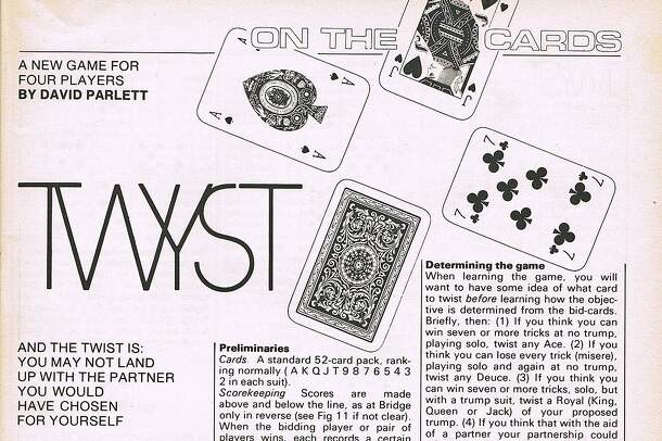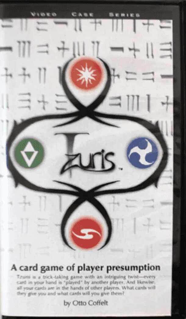 "Tzuris is an avoidance game with bidding, an elaborate trump suit and a gimmick. The gimmick being that when you play a card, you don't play it in front of yourself but in front of one of your fellow players. This is done in such a way that by the end of each trick, each player will have a card face down in front of them. These cards are then turned face...
