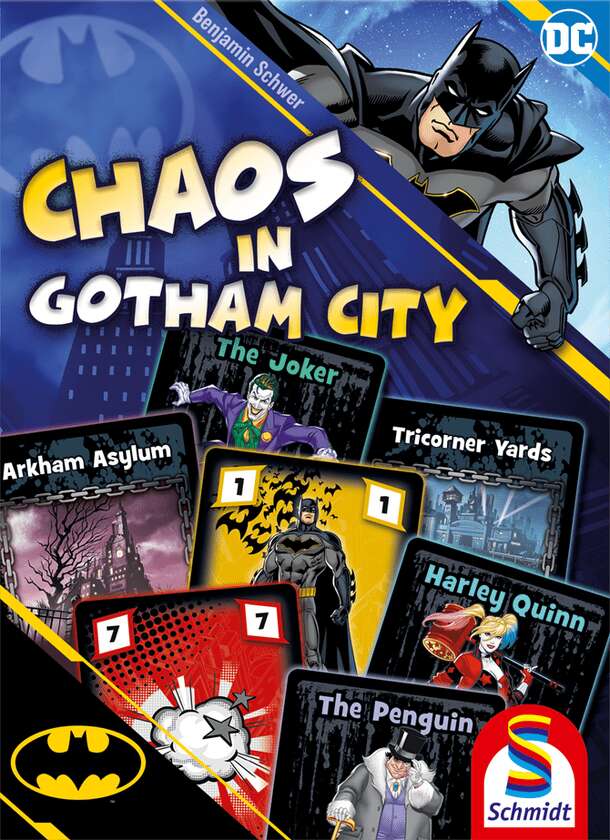 In the trick-taking game Chaos in Gotham City, each player becomes a villain and attempts to cause mayhem while avoiding encounters with Batman. You play as many rounds as the number of players. Each round, deal players 6-10 cards depending on the player count. The deck consists of 40 cards in four suits numbered 1-10, with some cards depicting either...