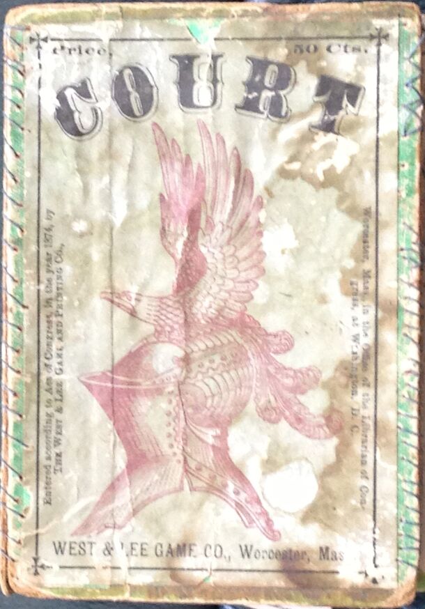 Court is played by two people with a deck of 24 cards: four suits (Gold, Blue, Black and Red) each with six different cards. These Cards are ranked by value: Crown (10), Royal (8), Knight (3), Esquire (2), Standard (1) and Jester (no value). There are two other cards of no value in each suit (Retainers and Serfs) available for a four player game. There...