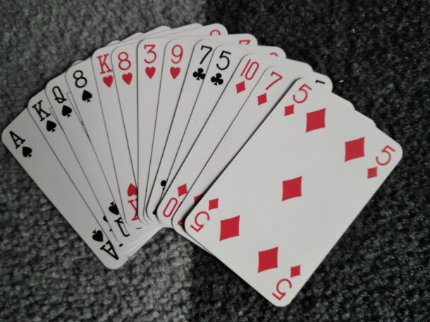 Crook is a trick taking game that requires each player to bid on the number of tricks they plan to take during a round of play. The person to the left of the dealer leads out by playing one card of any color and play goes clockwise with each player playing one card per turn. Players must “follow suit” by playing a card of the same color that was led out....