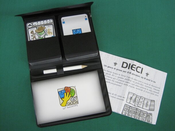 Published in a limited edition, plastic leather pack to celebrate the 10th anniversary of dV Giochi, Dieci is a trick-taking game with illustrations taken from many dV Giochi titles. The players are "Radiatov", a race of aliens who want to collect artwork from particular games. To start the game, each player receives ten cards (with some cards removed for...