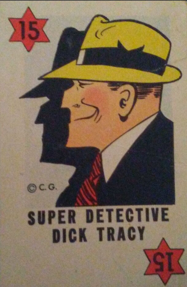A trick-taking game based on the 'Dick Tracy' comic strip. The 35-card deck is divided into three "Gang" and three "Detective" suits, each of a different color. The Detective suits are numbered 1-5, while the Gang suits are numbered 1-6. There is also one card each of the Gang Boss and Dick Tracy, each worth 15 points. Object of the game is to take as few...