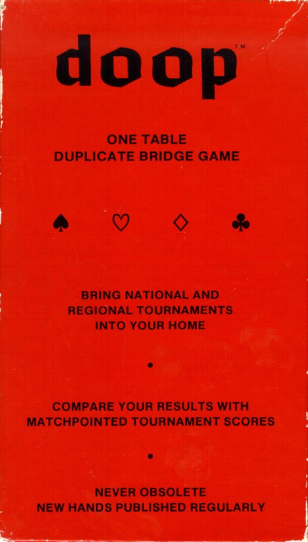 doop is a duplicate bridge game for four players. The two pairs compare their results against recorded results from national and regional tournaments. Each player has their own deck of cards, and the cards they select are shown in a unique plastic case. After bidding and playing the hand, the pairs can compare your result against match-pointed tournament...