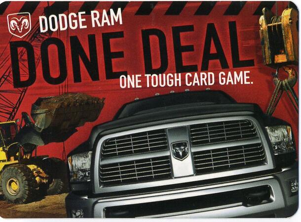 This card game was distributed as a promotional item by Dodge at auto shows, including the Texas State Fair. A variation on the classic "Go Fish", players attempt to match three cards, each with a tool and the same number (1-14), to complete a challenge that highlights the abilities of the Dodge Ram pick-up. Also included are two "DONE DEAL" cards that...