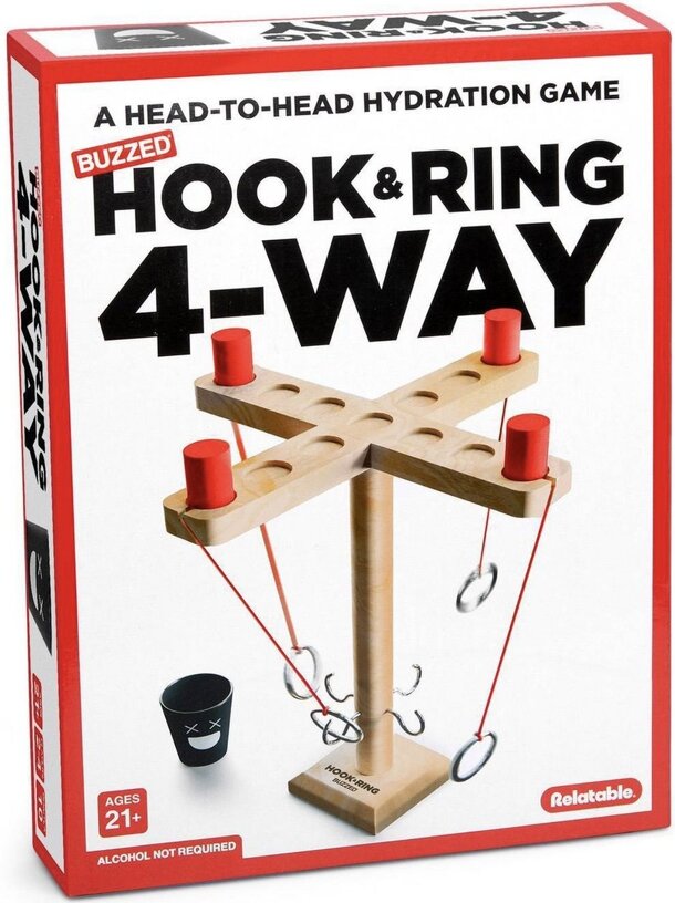 Get your party started with Buzzed 4-Way Hook & Ring Drinking Game by Relatable, the ultimate fast-paced ring toss challenge designed for adults 21 and up. Players swing their rings to hook the target and advance their pawns. The first to player to advance their pawn three times, reaching the center of the track, wins the game! (And gets to choose who...