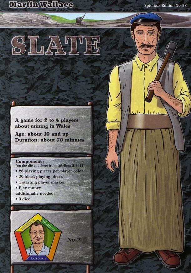 2- 4 Players compete to build and mine slate in North Wales. Players roll three dice to determine what actions they can take, though money can be spent to alter the die roll. Actions available to players include building a mine, selling slate or take a development action. The development actions either benefit players in the final scoring or allow players...