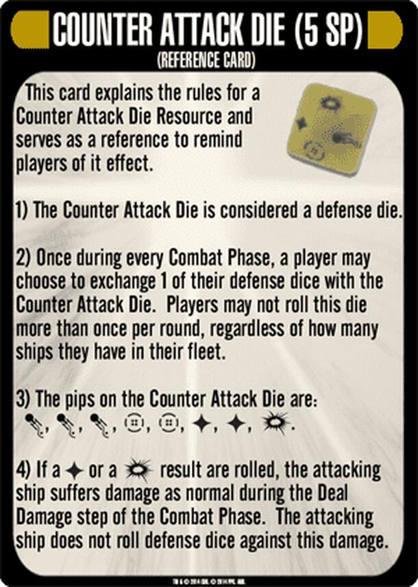 The Counter Attack Die is a participation prize given to players who participated in Month 1, "First Contact," of the Star Trek: Attack Wing Storyline Organized Play Event, The Collective. It is considered a Resource, and costs 5 Squadron Points. 1) The Counter Attack Die is considered a defense die. 2) Once during every Combat Phase, a player may choose...