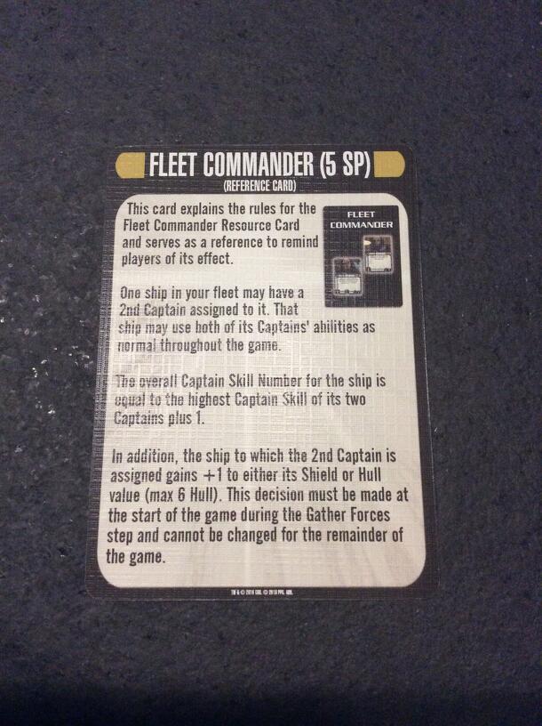 The Fleet Commander Resource is a participation prize given to players who participated in Month 1, "Attack on Gowron," of the Star Trek: Attack Wing Storyline Organized Play Event, Klingon Civil War. When using the Fleet Commander resource, you may assign two captains to a single ship. That ship may use both captains' abilities as normal throughout the...