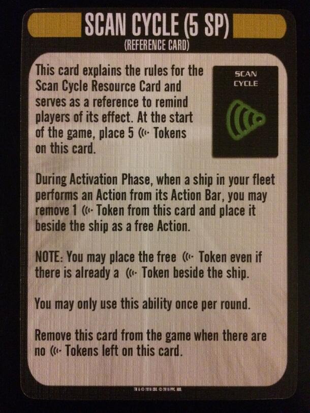 The Scan Cycle Resource is a participation prize given to players who participated in "The Trouble with Tribbles" episode Organized Play Event. It is considered a Resource, and costs 5 Squadron Points. When using this resource, you place 5 Scan tokens on it at the beginning of the game. Afterwards, once per round, when one of your ships performs an action...