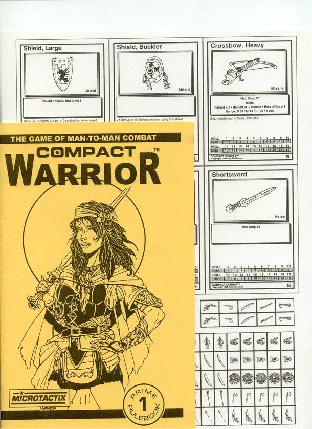 Compact Warrior is a game of individual combat using swords and shields or other fantasy-type weapons. Each player controls one or more "characters" and makes combat decisions for each character concerning where he moves, how he attacks and what the character's specific tactics are. Compact Warrior is the core game of the Compact Combat tactical game...