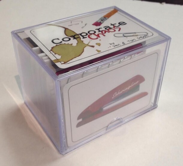 Corporate Chaos is a new independent card game. You and your fellow 'corporate drones' struggle to keep your job. You also don't want to get promoted or else you will become part of the soulless corporate machine. Try not to get too stressed out though or you'll burn out. Each player (drone) is given a tracker for his/her HR Warnings, Career, and Stress...