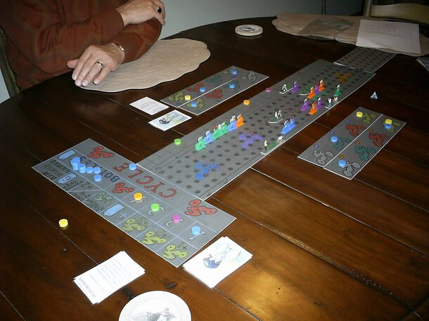 Cycle is an easy to learn yet innovative strategic racing game that uses an action based type of system. No dice, cards, or record keeping are needed and scores are kept on the score track as the race progresses. Each player controls a team of four cyclist which one is a leader in each team. The leader has one bonus action that can be performed during the...