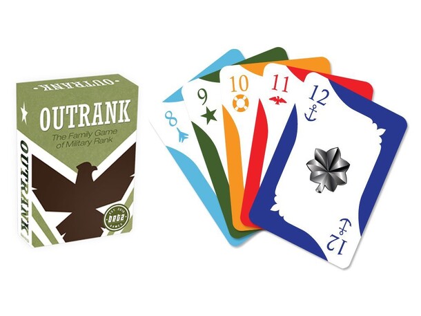 OutRank your opponents and be the first person to exhaust their playing hand. OutRank features the five branches of the Military. Army, Navy, Marines, Air Force and Coast Guard. In OutRank each player is dealt 7 cards, the remaining cards become the draw pile. The first player challenges the player to their left with 1-5 cards of the same rank from their...
