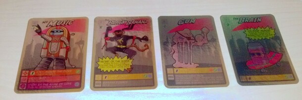 Four KS-exclusive, foil heroes which were given for free to backers of the Pack of Heroes campaign. They are Mr. Music (a robotic jukebox), The Black Banana (a ninja chimp), Gum (a sentient piece of bubblegum) and The Brain (a brain in a jar riding a skateboard). The four heroes are Mercenaries and aren't part of any established team. Instead, they can be...